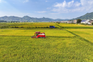 2021年10月28日,江西省抚州市金溪县琅琚镇安田村优质稻种植基地,成片的晚稻喜获丰收,金黄的稻田与民居、青山、公路等相映成趣,构成一幅色彩斑斓的丰收画卷。金秋时节,金溪县各地晚稻喜获丰收,当地农民抓住天气晴好的有利时机,加紧抢收晚稻。