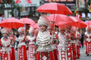 2021年1月20日,苗族妇女在贵州省丹寨县县城集市上选购传统苗族服装。