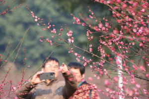 2022年2月10日,浙江省台州市路桥区路北街道蔡於泾河岸的“口袋公园”里,红梅盛开,市民正在欣赏梅花美景。近年来,路桥区在生态环境治理和“五水共治”行动中,坚持党建引领,把河道整治、河岸美化、“口袋公园”建设等进行统筹,实现生态环境治理和市民公园建设等的有机融合、齐步推进,改善了人居生活环境,同时美化并提升了城市形象,提升了人民群众的幸福感、获得感。