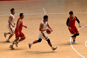 2022年8月6日,在河北省邯郸市大名县友谊篮球赛比赛现场,比赛一方在对方球员的防守下准备传球。