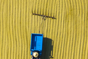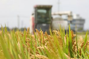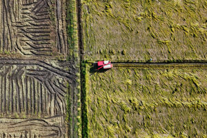 二造水稻熟了,白鹤飞在上方寻找采收的目标。