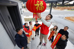 2022年9月12日,四川省达州市。四川省达州市达川区米城乡吴家营村红乡种植合作社农民和党员志愿者在晾晒刚采摘的红辣椒。