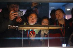 2019年11月29日,位于北京市海淀区的清华大学艺术博物展厅内展览的彩绘骑马女俑。彩绘骑马女俑,唐,麟德元年(公元664年),高37.3cm,长26cm;陶,1972年礼泉县郑仁泰墓出土,陕西历史博物院收藏。