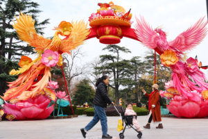 2023年1月10日,浙江省湖州市长兴县东鱼坊历史文化街区装饰一新,孩子们正在观赏“萌兔”造型景观。