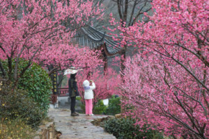 2月11日,四川省达州市,通川区大寨子公园里的梅花正迎春绽放,市民在花间摄影。