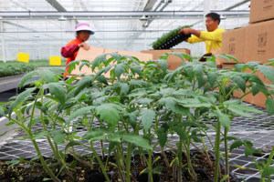 2023年4月6日,江西省吉安市吉水县八都镇桥上村百蔬家庭农场,村民正在为黄瓜苗挂绳。
