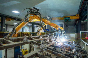 2023年4月26日,在山东省临沂市临沭县一化工企业,自动机械手在进行码垛作业。