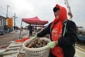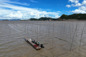 6月8日,浙江省台州玉环市鸡山乡渔业码头上一派繁忙,补网师傅和渔民正在修补灯光围敷网渔网