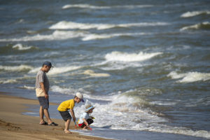 7月14日傍晚,在广西北海银滩景区众多游客海边踏浪欣赏夕阳美景。