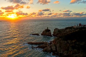 7月14日傍晚,游客在广西北海银滩潮雕广场欣赏夕阳美景。