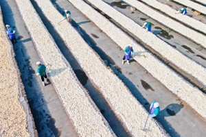 2023年10月24日,霜降节气,江苏省兴化市林湖乡晾晒小麦面进入忙碌期。小麦面加工是林湖乡的传统加工业,已有上百年的历史。近年来,该乡大力实施“农产品+合作社+品牌”发展模式,带动村民增收致富,助推乡村振兴。