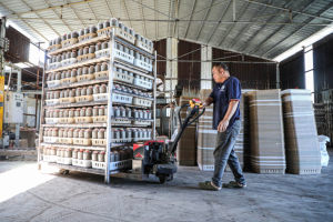 2024年1月11日,江苏省淮安市洪泽区东双沟镇滨湖社区秸秆回收点,工人在粉碎秸秆,供宁夏、甘肃、山东等地养牛区做饲料。