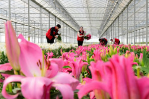 2024年1月16日,山东省东营市东营区黄河口兰花谷智能化温室大棚里春意盎然,150多个品种、300万余株蝴蝶兰陆续绽放,争奇斗艳,技术员忙着对兰花进行修整、组盆、搬运、包装,供应春节市场。该基地是集育苗组培、养植栽培、研发检测、展示销售于一体的名贵兰花高端智能化生产基地,是长江以北规模最大、品种最多、档次最高的兰花种植基地,已培育梦香兰、天鹅兰、文心兰、蝴蝶兰等150余个品种,还应用5G数字农业智能物联网技术,所有控制设施、水肥浇灌、温湿光精准检测等纳入一张“网”管理,实现了花卉种植管理的标准化、数字化、智能化。
