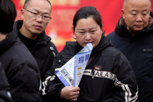1月27日,在安徽省亳州市利辛县市民健身公园,求职者“2024年利辛县春风行动暨就业援助月专场招聘会”上寻找合适的岗位。
