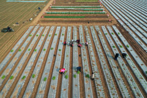2024年2月27日,在河北省石家庄市栾城区南浪头村农田里,菜农正在种植橄榄菜苗(无人机照片)。