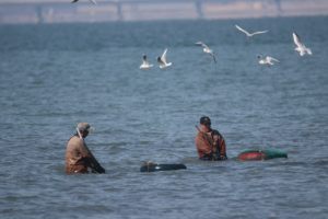 2023年3月7日,在山东省荣成市海驴岛附近海域,大量的黑尾鸥在海面上嬉戏、觅食。