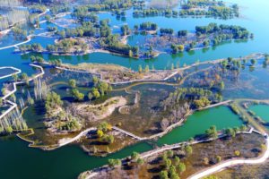 3月24日,市民在甘肃省定西市安定区生态园冒雪散步(无人机照片)。