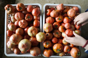 3月31日,在山东莱西市青岛凯盛浩丰智慧农业产业园,工人刚刚采摘的西红柿。