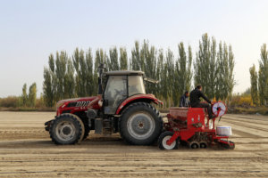 2024年4月11日,河南省开封市龙亭区北郊乡石砦村农民正在田间播种油葵。