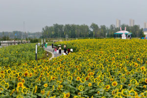 2024年4月26日,在山东省聊城市江北水城旅游度假区望岳湖星空乐园,工作人员在对太空城堡进行检修、维护。