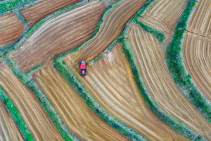 2025年1月11日,广西贺州市平桂区鹅塘镇塘面村农机手在驾驶拖拉机犁地(无人机照片)。