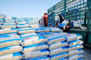 2025年2月10日,湖南省衡阳市祁东县衡缘物流园一农资仓储中心,工人正在装卸化肥。