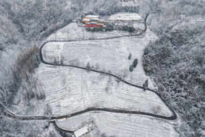 2025年4月6日,自驾游的游客在陕西省安康市平利县长安镇,女娲银峰茶园生态景观公路上游玩赏景享春光(无人机照片)。