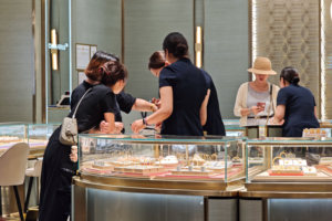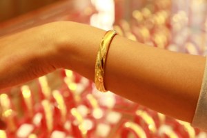 2025年4月12日,江苏省连云港市海州区一家金店,顾客在选购黄金饰品。