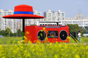 4月23日,游客在安徽省亳州市谯城区十八里镇亳药花海休闲观光大世界赏花游玩(无人机照片)。
