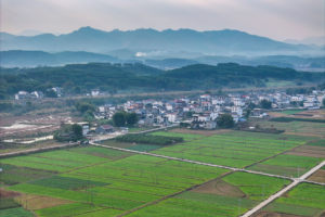 2025年4月28日,湖南省常德市澧县澧南镇,大片渐次成熟的油菜籽与集镇遥相映衬。