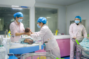 2025年5月12日,重庆东华医院手术室,手术台前忙碌的护士(左二、左三)。