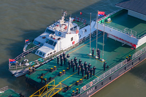 2025年5月15日,重庆市奉节县,长江三峡瞿塘峡段水域,来回穿梭的船只与清澈的江水构成了一幅美丽的夏日景色(无人机照片)。