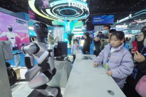 2025年7月11日,江苏连云港。在“焕化世界”展区,孩子们在观看“科技灯塔”模型。