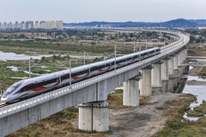 2025年7月22日,兰新高铁一列动车高速行驶经过山丹马场油菜花海。