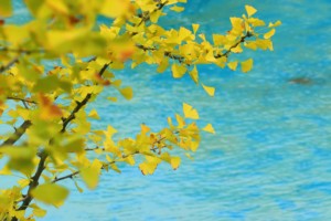 2025年9月5日,江苏省苏州市南门路几片银杏树叶由青转黄的秋意景色。
