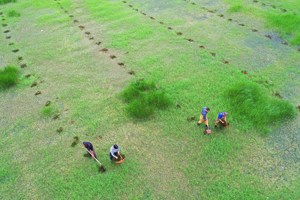2025年9月21日,在江苏省淮安市洪泽区东双沟镇邵庄村,村民栽植伊乐藻,为春季虾苗、蟹苗投放储备“口粮。(无人机照片)
