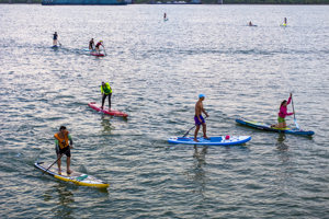 10月2日,在贺州市昭平县城桂江河段,众多游泳爱好者准备畅游桂江。