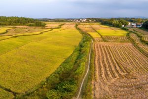 2025年10月7日,在江苏省淮安市洪泽区东双沟镇张庄村,一群鹭鸟飞翔空中,田间金黄的稻谷、塘口觅食的鹭鸟、农舍,构成一幅“金秋生态村景”画。
