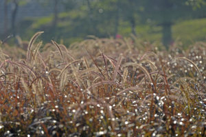 2025年10月8日在湖北省恩施土家族苗族自治州恩施市城区拍摄挂满露珠的狗尾巴草。
