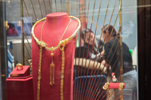 2025年10月8日,在云南省蒙自市一家金店,店员展示黄金首饰。