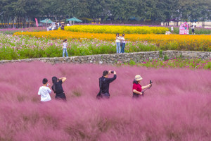 2025年10月14日,江苏省连云港市灌云县伊园景区,游客在欣赏粉黛乱子草。