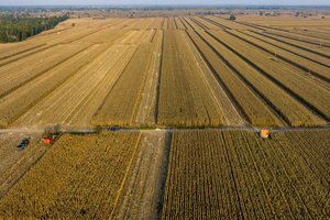 2025年10月16日,在山东省东营市广饶县李鹊镇小张村的农田里,农民驾驶履带式收割机正在收割玉米。(无人机照片)。