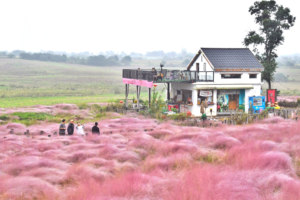 2025年10月16日,山东枣庄滕州市红荷湿地景区内,游客在粉黛乱子草丛内拍照留念。