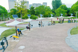 2025年10月19日,市民在山东省荣成市桑干河植物园内一处“口袋公园”健身、游玩(无人机照片)。