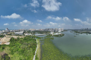 2025年10月21日,安徽省亳州市谯城区陵西湖湿地公园,层林尽染,色彩斑斓,水天一色,与亭台桥榭、楼房建筑等交相辉映,勾勒出一幅美丽的深秋城市画卷。(无人机拍照)