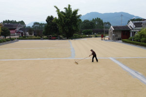 2025年10月28日,江苏省盐城市射阳县新洋农场,在一处高标准粮食晒场上,职工正在装运晾晒好的水稻,确保秋粮颗粒归仓。