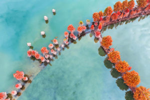 2025年10月31日,湖北省十堰市竹山县双台乡,万山红遍,层林尽染,G242国道犹如美丽的玉带,穿越五彩斑斓的群山,连接一个个美丽的村庄。(无人机照片)