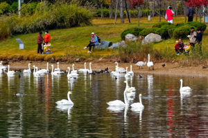 2025年11月2日,在山东省荣成市成山镇西霞口隆霞湖公园,大天鹅在湖面上栖息、游弋。