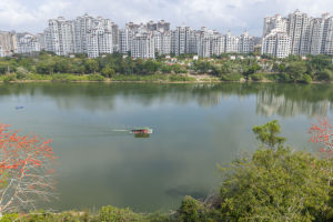 2025年11月4日,海南省琼海市民在万泉河游览区观察水情。