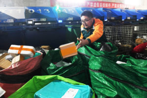 图为2025年11月11日,江苏省宿迁市公安局湖滨新区分局职教园区派出所民警,在辖区寄递网点对寄递物品进行安全检查,提醒从业人员严防违禁物品流入社会。